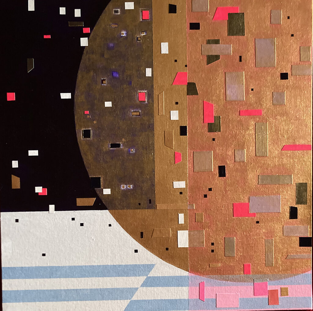 I am fascinated by pattern, rhythm, and the expressive power of negative space. I am autistic and dyslexic, and this shapes how I see and work: through a strong visual sensitivity to shape, spatial relationships, movement, and repetition rather than linear narrative. My paintings explore layering, accumulation, and drift, using intersecting bands, drifting blocks, and curved forms that emerge, dissolve, and re-form across the surface. All my work is inspired by music, which provides both structure and momentum. In particular, I respond to the spatial bass and echo of dub reggae, and the melodic flow and emotional shifts of Taiwanese pop.