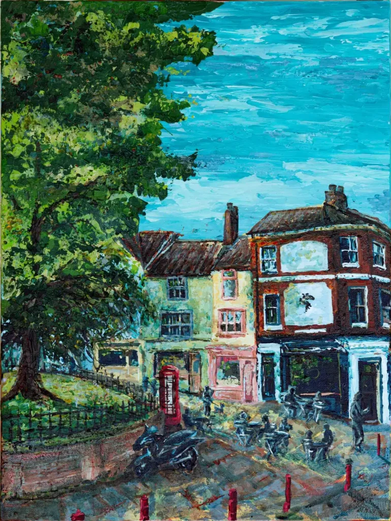 Heavily inspired by the Dutch impressionists, Pinch favours producing impasto palette knife work with vivid colour to produce detailed and heavily textured pieces that explore the connection between people and place. However in more recent works, Pinch has been travelling with a watercolour and ink set to capture snapshots of peaceful moments in major cities both within Norwich and further across Europe.